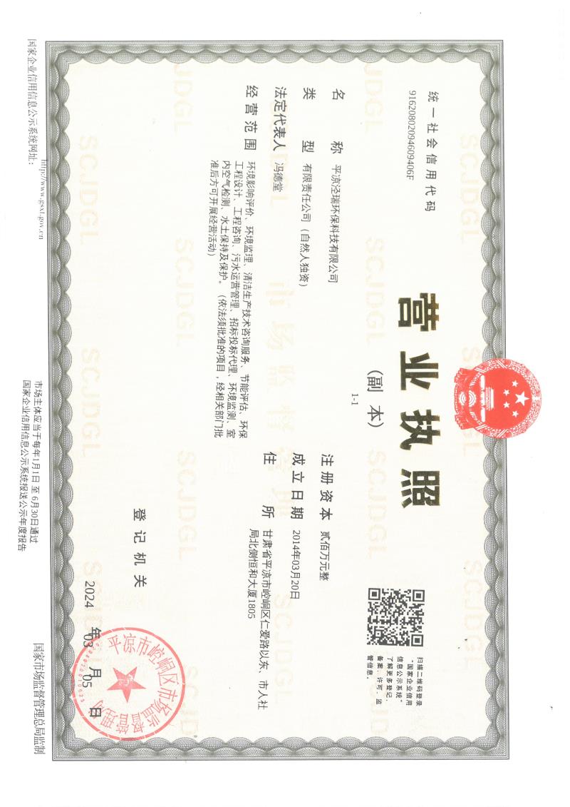 平?jīng)鰶苋瓠h(huán)??萍加邢薰緺I(yíng)業(yè)執(zhí)照