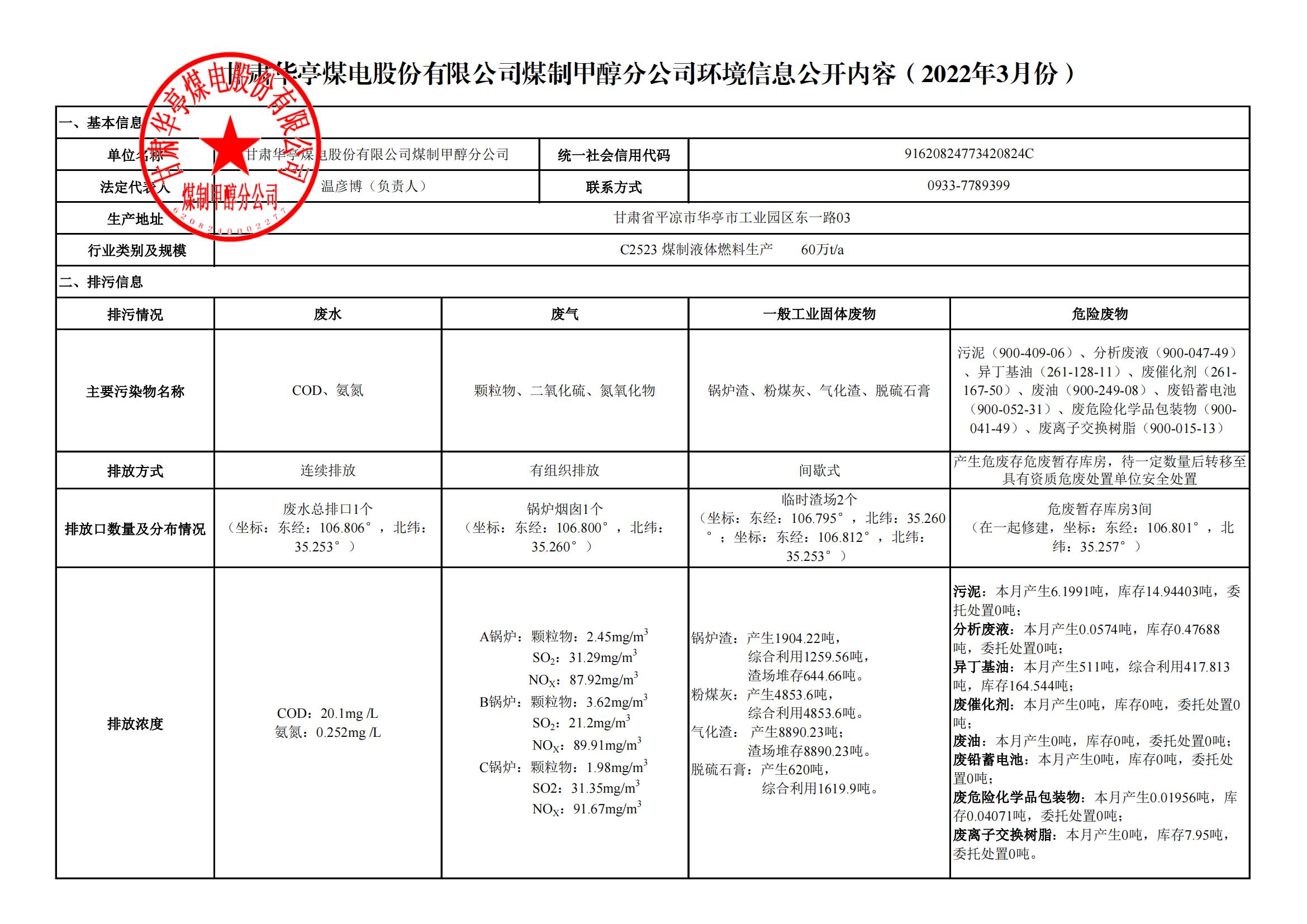 煤制甲醇分公司環(huán)境信息公開(kāi)內(nèi)容(2022年3月)